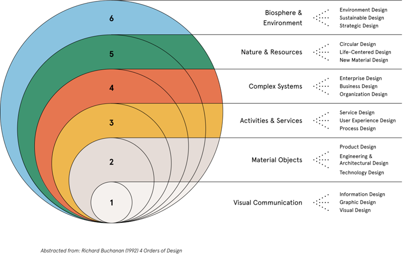 Sinds kort gaan er steeds meer stemmen op om hier nog twee niveaus aan toe te voegen: het ontwerpen van nature & resources (5) door bijvoorbeeld aan circular design te doen, en het ontwerpen van biosphere & environment (6) door aan environment design te doen. Waar het in niveau 4 om het realiseren of veranderen van kunstmatige systemen gaat, daar werk je in niveau 5 en 6 binnen (en met) natuurlijke systemen. Tot niveau 4 staan begrippen als maakbaarheid, voorspelbaarheid en vaak schaalbaarheid centraal. Kunstmatige resultaten worden doelgericht nagestreefd. In niveau 5 en 6 is staan duurzaamheid, diversiteit en weerbaarheid centraal waarbij met nadruk gewerkt wordt met onzekerheid en onvoorspelbaarheid. Met een brede en inclusieve blik worden op doelvindende wijze interventies geprobeerd om tot een voor ieder betere toekomst te komen. Van niveau 1 naar 6 gaat de complexiteit omhoog en de voorspelbaarheid omlaag.